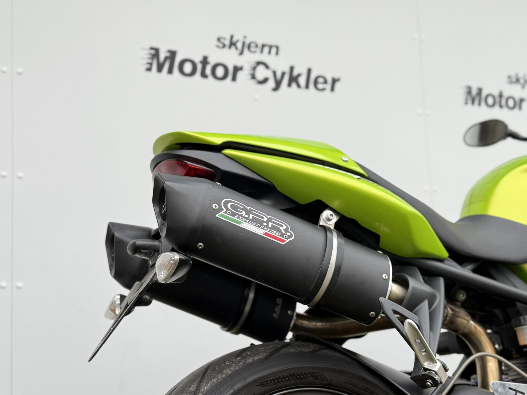 Den indsprøjtningsstyrede motor sikrer en jævn og præcis respons, mens gearindikator giver et godt overblik under aktiv kørsel. Den monterede carbon udstødning bidrager til et mere markant og sporty udtryk, og den alternative nummerpladeholder understreger det rene, minimalistiske design, som Triumph Street Triple er kendt for.